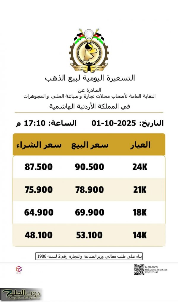 وبلغ سعر غرام الذهب من عيار 21 الأكثر تداولا بين المواطنين 78.9 دينارا.