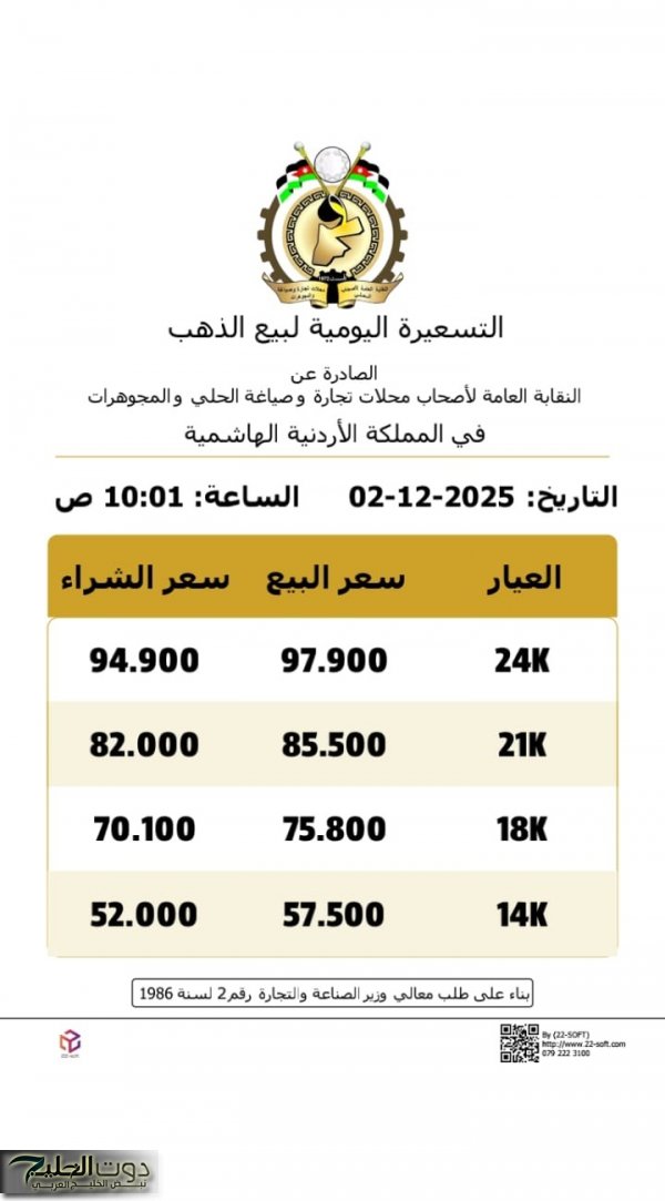 أما أسعار بيع الذهب للعيارات الأخرى، فقد سجل سعر غرام عيار (24) في محال الصاغة 97.90 دينارا، في حين بلغ سعر بيع غرام الذهب من عيار (18) 75.80 دينارا، وعيار (14) بلغ سعره 57.50 دينارا.