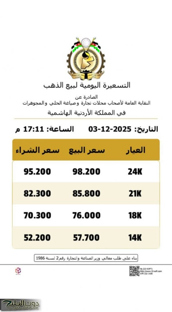 أما أسعار بيع الذهب العيارات الأخرى، فقد بلغ سعر غرام عيار (24) في محال الصاغة 98.20 دينارا، وبلغ سعر بيع غرام الذهب من عيار (18) 76 دينارا، وعيار (14) بلغ سعره 57.70 دينارا.