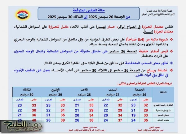 وتوقعت هيئة الأرصاد أن يشهد طقس الأيام المقبلة، نشاط في الرياح بداية من غد الجمعة 26 سبتمبر حتى الثلاثاء 30 سبتمبر على أغلب الأنحاء يعمل على تلطيف الأجواء في الظل وفي فترات الليل.
