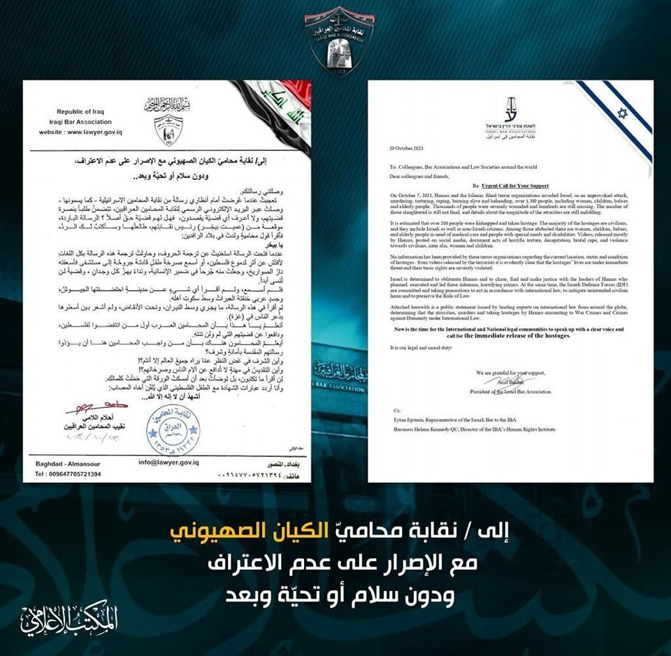 رياض - احمد صلاح - أعلنت نقابة المحامين العراقيين، اليوم الاثنين، عن تسلمها رسالة من نظيرتها الإسرائيلية، فيما ردت على الرسالة ووصفت النقابة أنها "نقابة الكيان الصهيوني".
