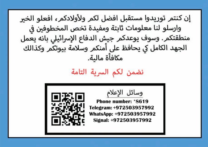 رياض - احمد صلاح - وزعت المؤسسة الأمنية الإسرائيلية منشورات في قطاع غزة، تدعو فيها الفلسطينيين إلى إرسال معلومات عن الأسرى لدى حركة حماس، مقابل الحصول على مكافأة مالية.