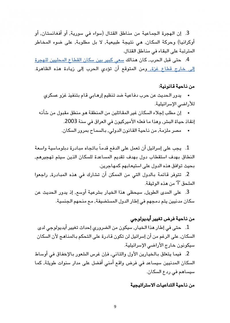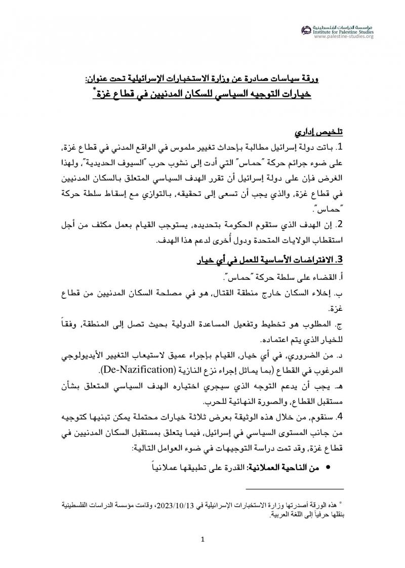 رياض - احمد صلاح - نشرت مؤسسة الدراسات الفلسطينية وثيقة أصدرتها وزارة الاستخبارات الاسرائيلية بتاريخ 13 /10 /2023.